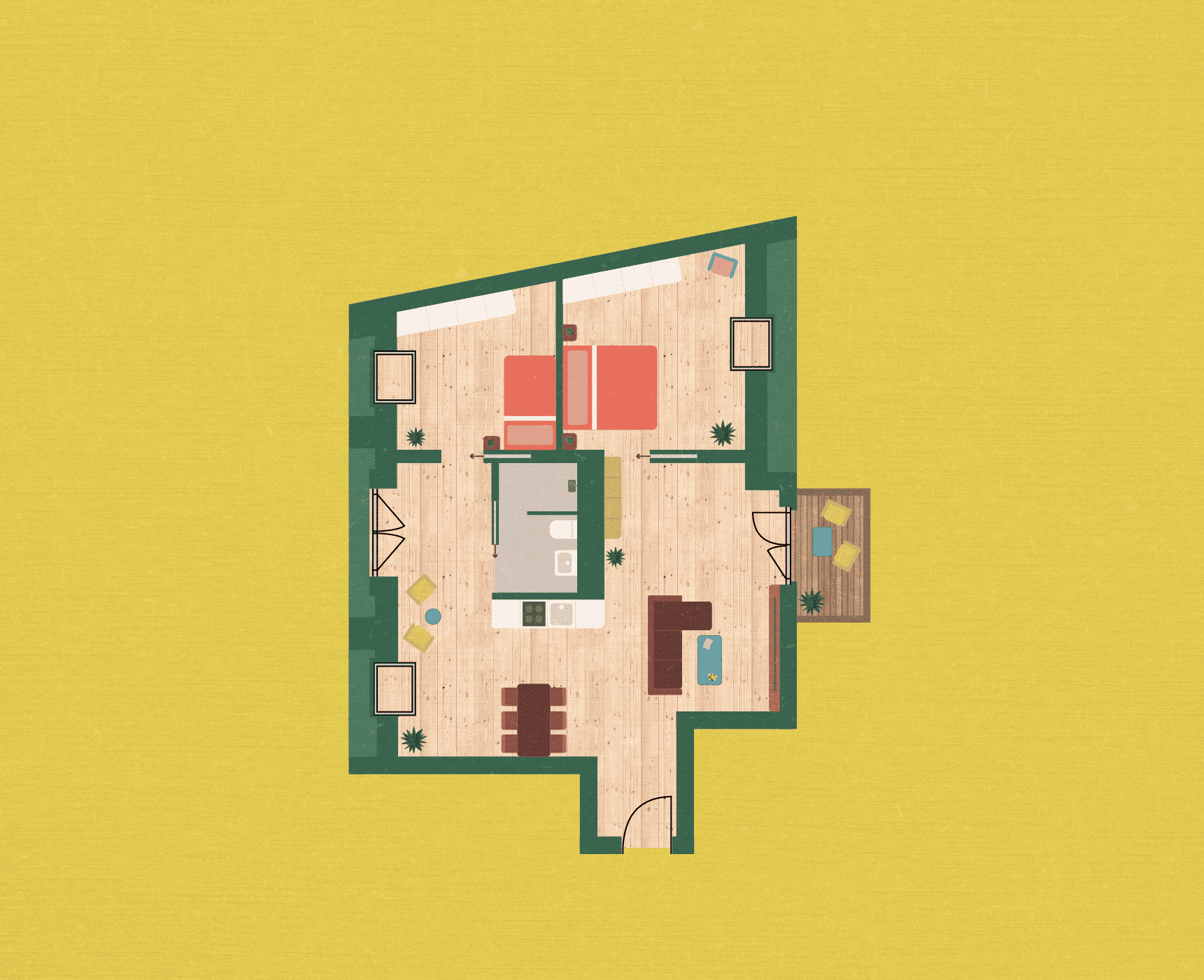 Eine durchgesteckte Wohnung, die sich von Ost nach West erstreckt. Sie bietet den Blick auf den Obstgarten – frisches Obstpflücken direkt vor der Tür.